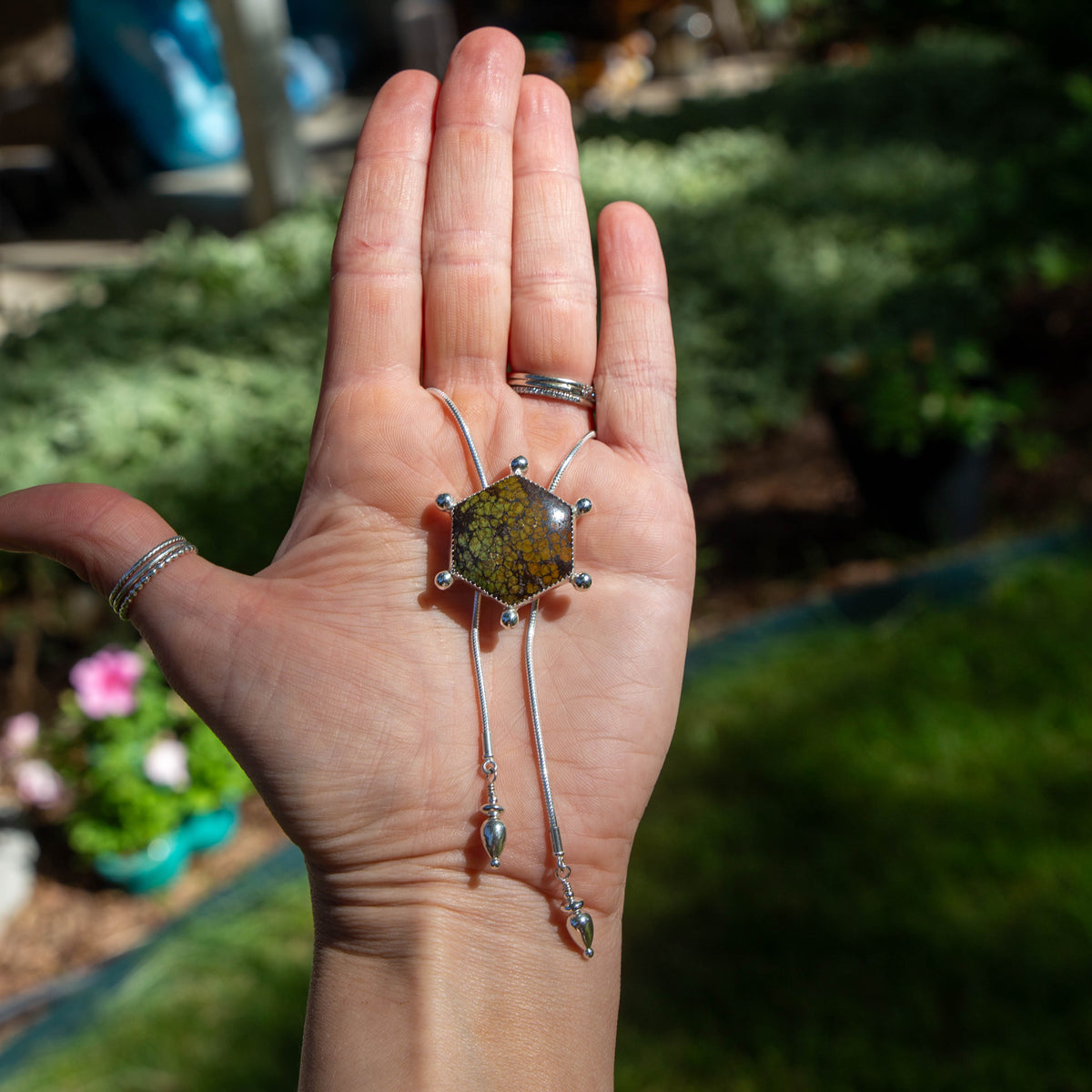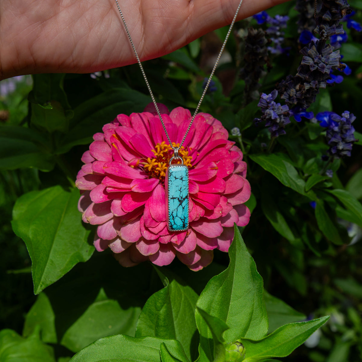 36" Hubei Turquoise Hexagon Shaped Sterling Silver Chain Bolo La Femme