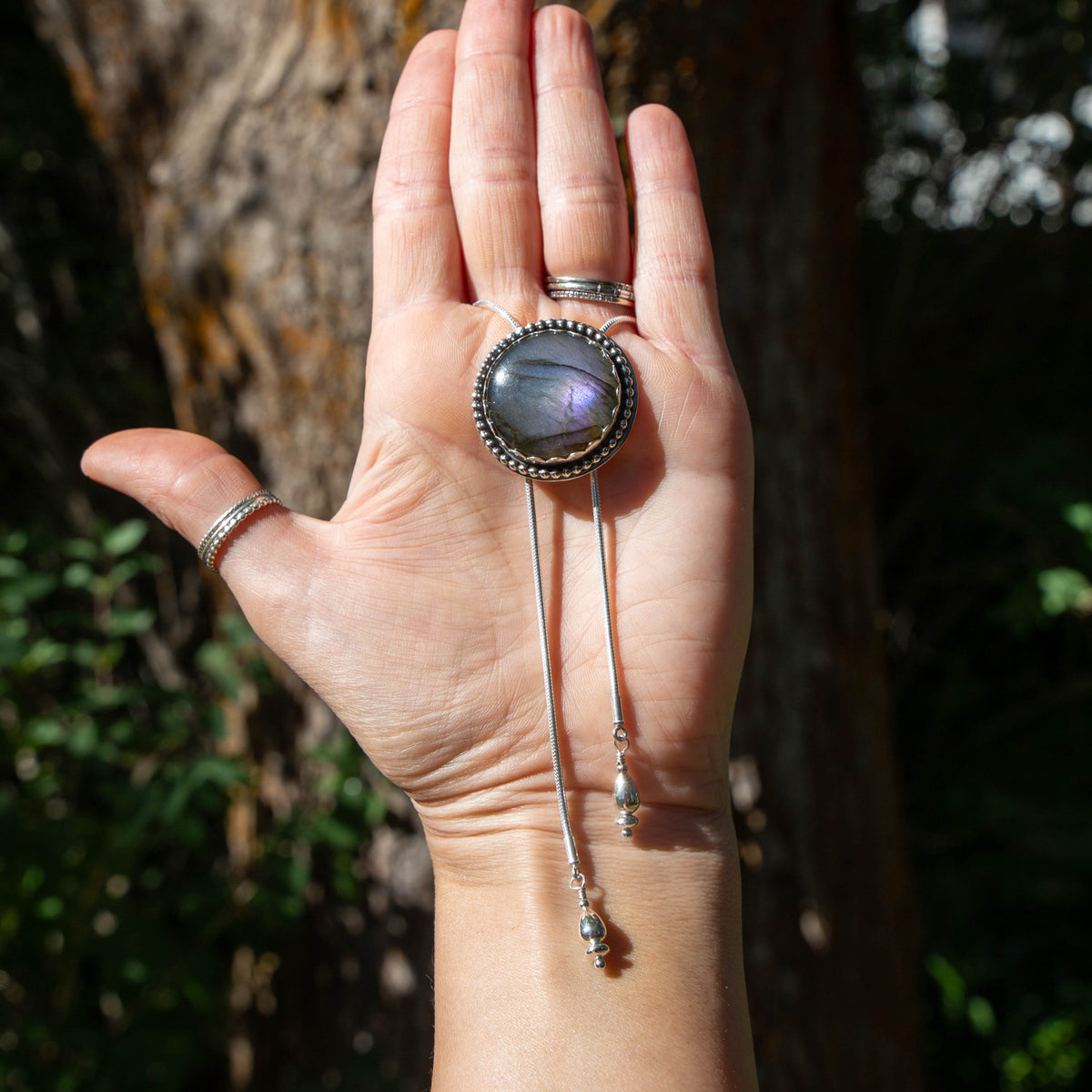36" Labradorite Circle Sterling Silver Chain Bolo La Femme