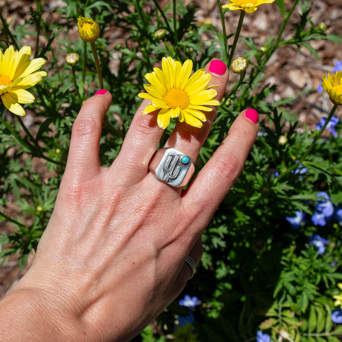 12 Kingman Turquoise Cactus Sterling Silver Signet Ring (Size 12)