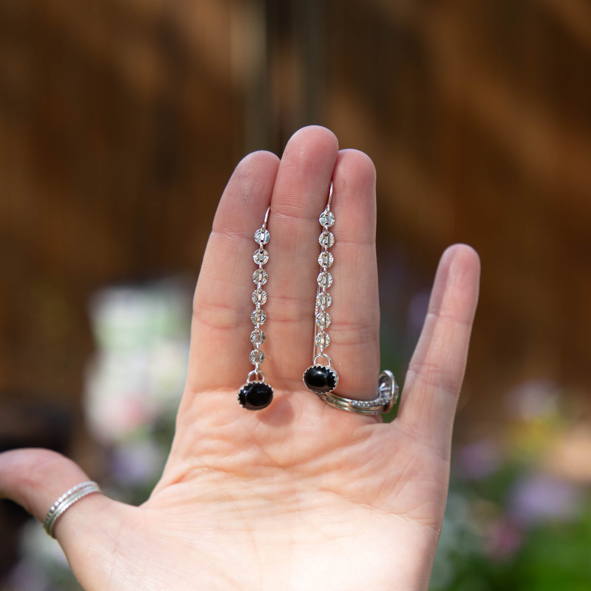 Black Onyx Oxidized Coin Chain Sterling Silver Threader Earrings