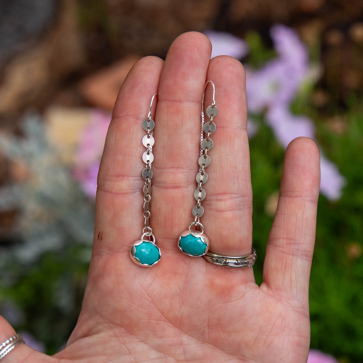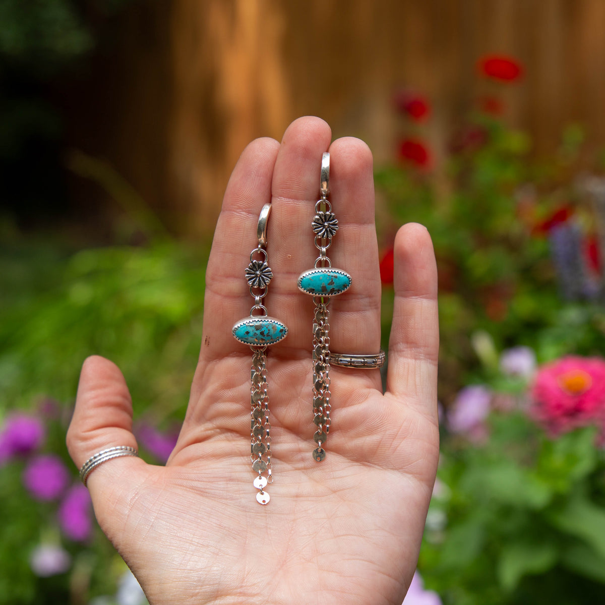 Chinese Turquoise Oxidized Coin Chain Sterling Silver Threader Earrings